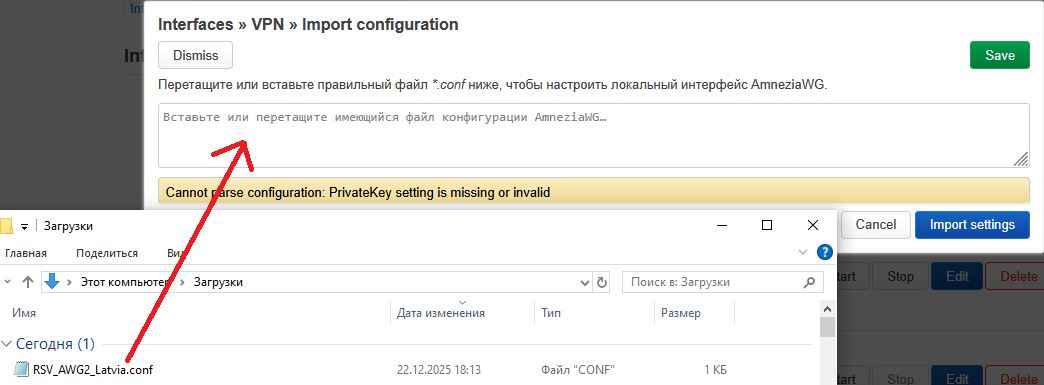 8. В настройках интерфейса нажмите Load Configuration и вставьте содержимое .conf файла или загрузите его целиком.