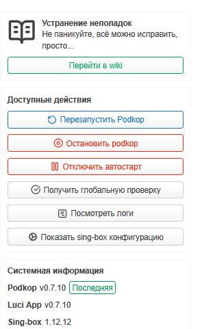 Podkop - это утилита для OpenWrt, предоставляющая удобный веб-интерфейс для управления VPN по различным протоколам, в том числе AmneziaWG 2 и VLESS.