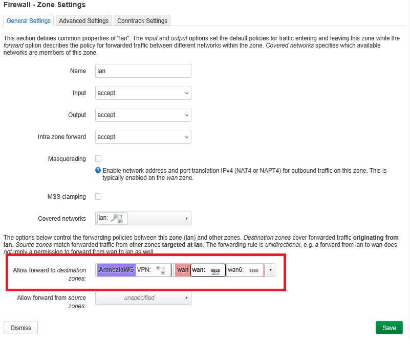В поле Allow forward from source zones выберите зону lan